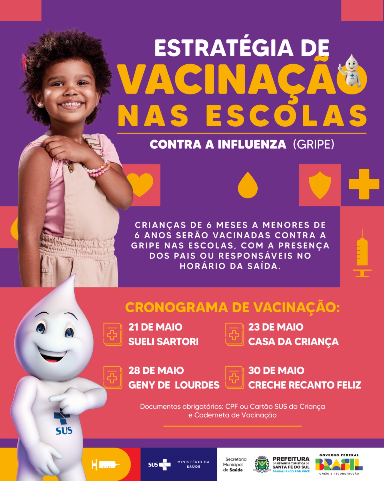 A Prefeitura Municipal da Estância Turística de Santa Fé do Sul, por meio da parceria entre as Secretarias de Educação e de Saúde, realiza uma ação conjunta de vacinação contra a gripe voltada às crianças de 6 meses a menores de 6 anos. A campanha ocorrerá diretamente em unidades escolares, facilitando o acesso das famílias à imunização infantil.