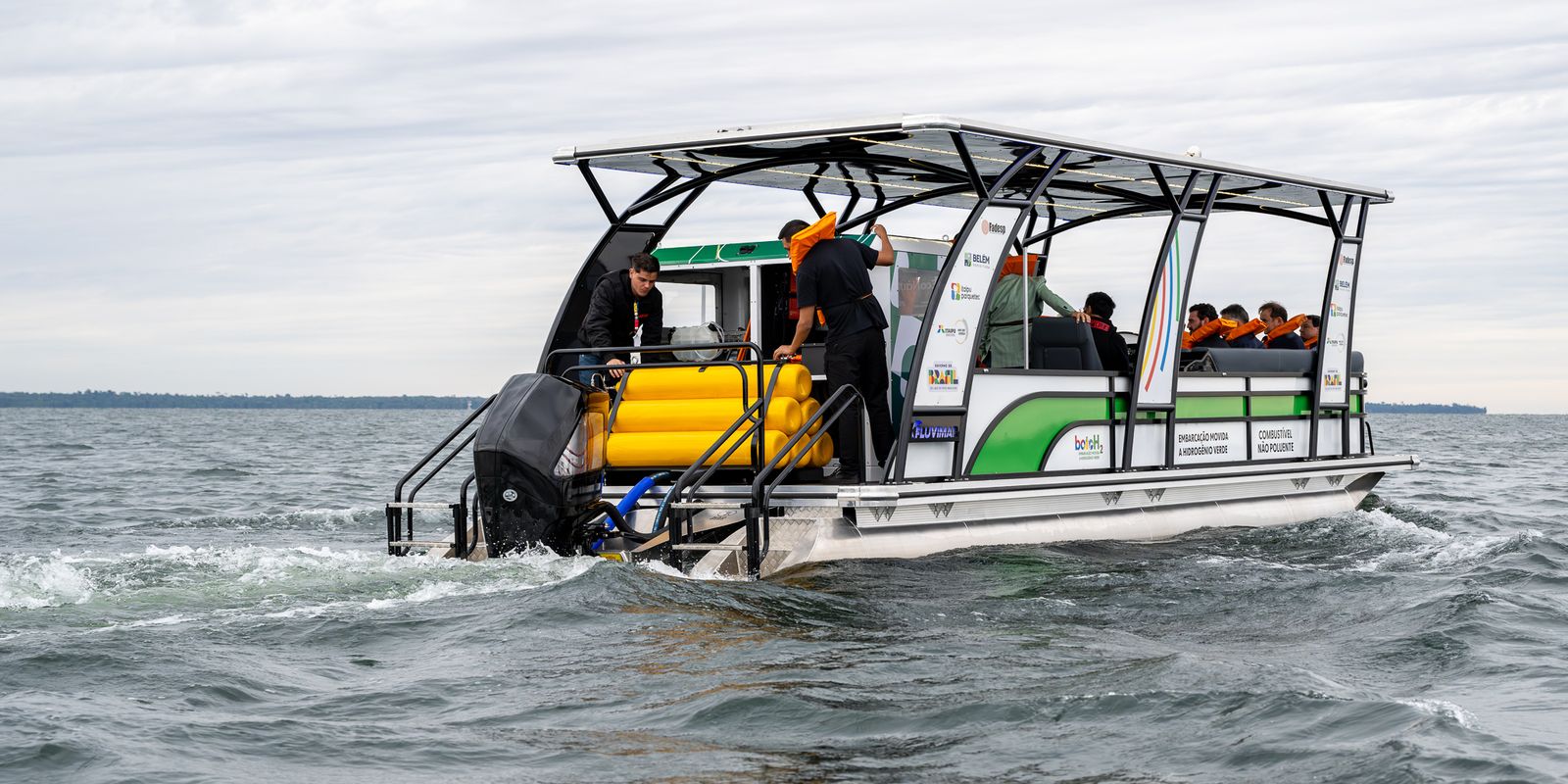 A embarcação também conta com sistema para aproveitar energia solar e, durante a navegação, não emite barulho nem poluentes. O único resíduo do motor é água pura.